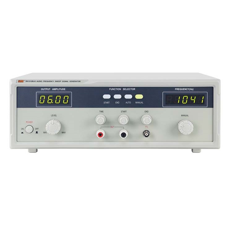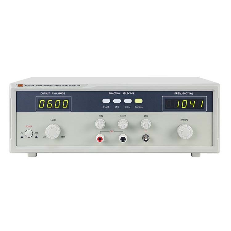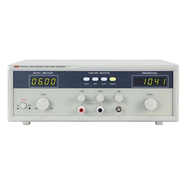 RK1212系列音頻信號發生器采用先進的壓控振蕩電路,產生穩定、低失真的正弦波信號。輸出幅度、頻率均采用數碼顯示、掃頻范圍可達1:1000以上,掃頻的起點和終點可任意設置,具有開機延時輸出、短路保護等功能。